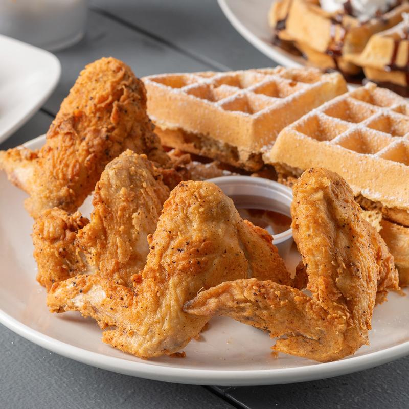 4 fried whole wings and a Belgian waffle served with warm syrup & melted butter