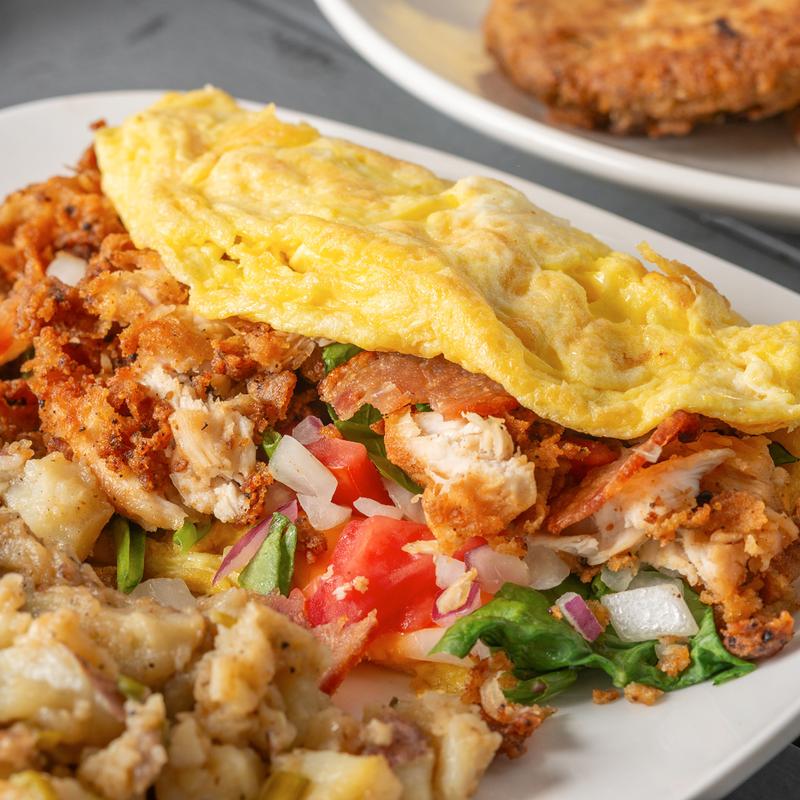 3 egg seasoned omelette served with your choice of meat (boneless chicken, bacon or chicken sausage), American cheese, mixed onions, diced tomatoes, and fresh spinach