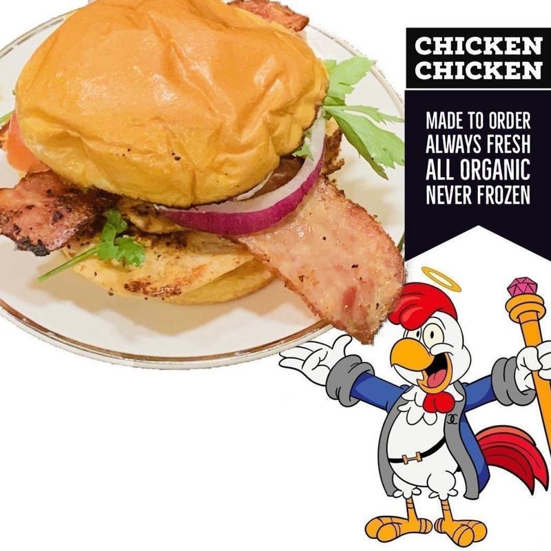 Hand-seasoned chicken breast topped with chicken bacon, fresh spinach, pickles, Bermuda onions, and mayonnaise, served on a butter-grilled brioche bun. Add Swiss cheese or American cheese for an additional price