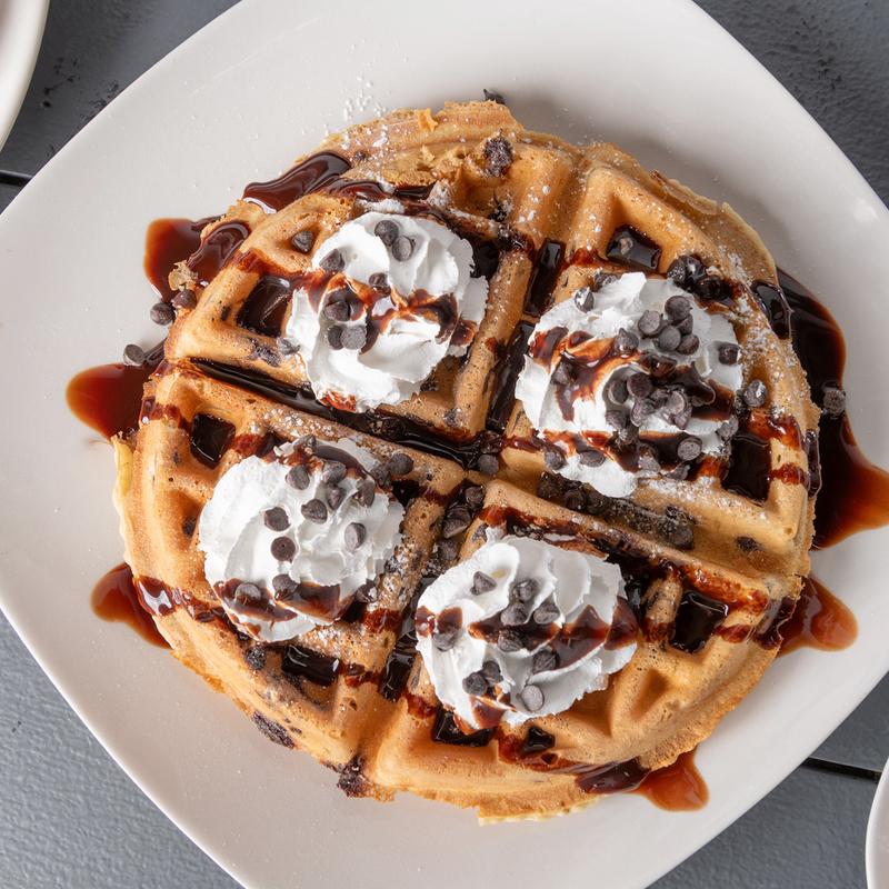 Belgian malted waffles cooked with whole chocolate chips and topped with chocolate syrup and whipped cream