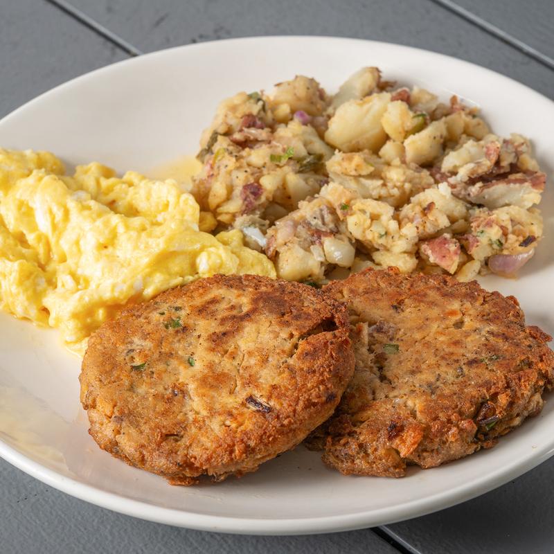 Freshly made to order grilled Salmon croquettes lightly seasoned and served with white rice or heavenly potatoes and scrambled eggs. Served 9 am - 11:30 am