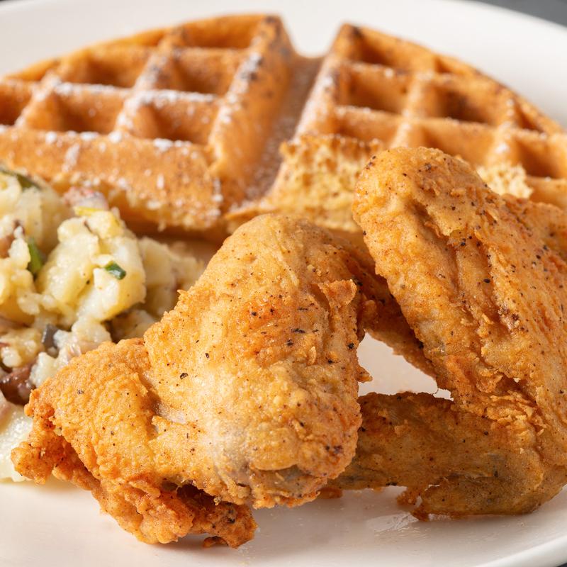 4 fried whole wings, heavenly potatoes, and a Belgian waffle served with warm syrup & melted butter
