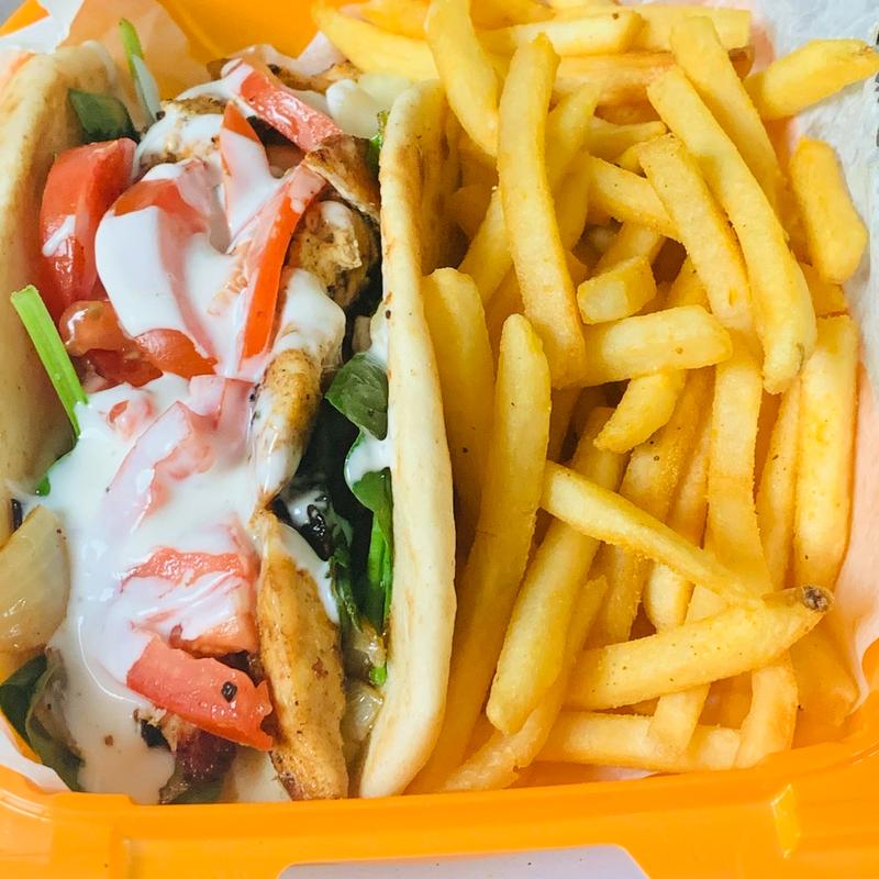 All white chicken boneless breast, diced & sautéed in our garlic butter house seasoning, a medley of onions and fresh spinach, topped with buttermilk dressing and chopped tomatoes, wrapped in warm pita bread. Add Swiss cheese or American cheese for an additional price