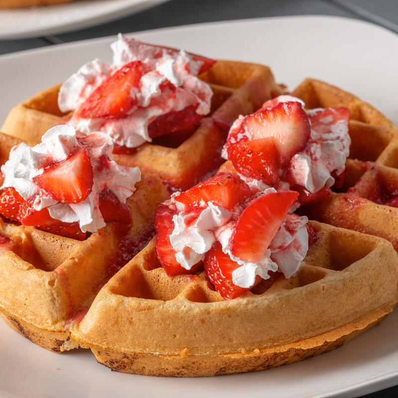 Belgian malted waffles topped with fresh strawberries and strawberry puree and whipped cream